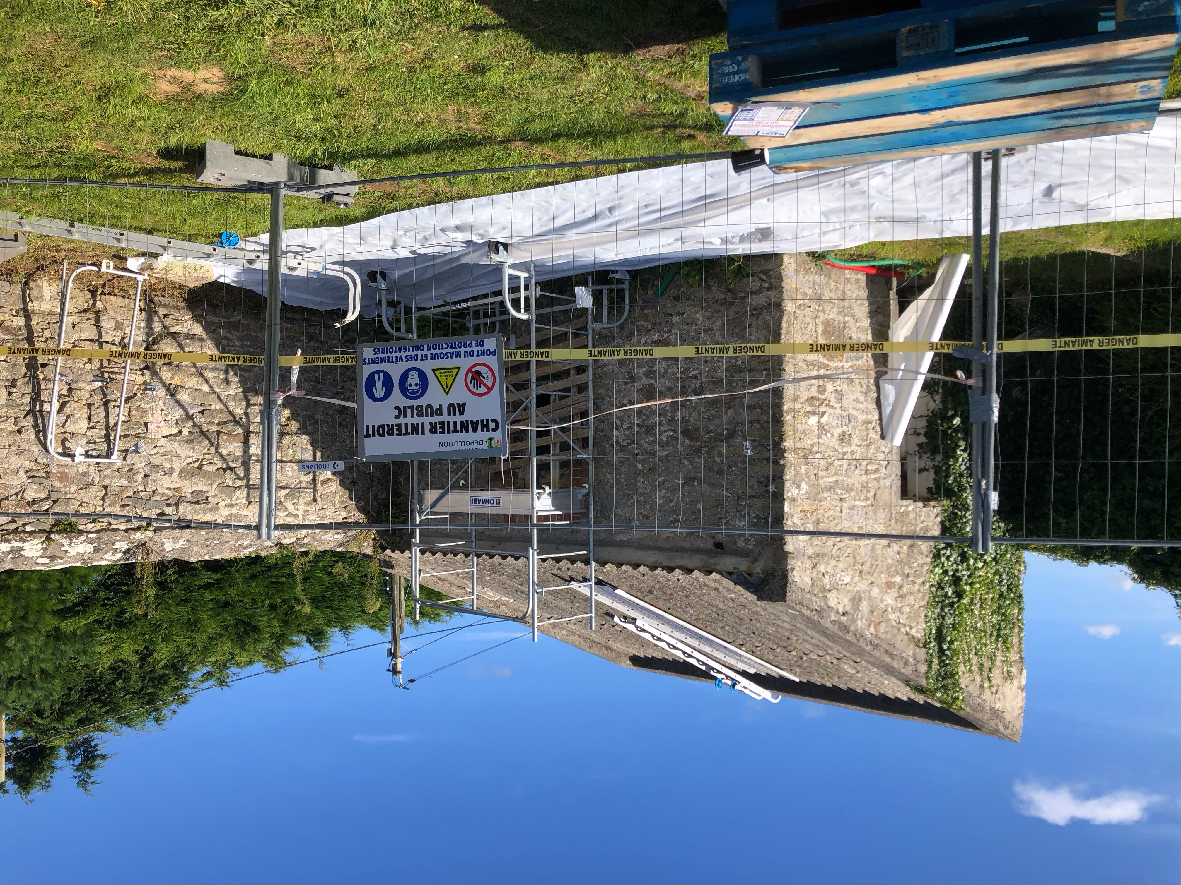 Le désamiantage de la dépendance futur accueil ayant été effectué, les travaux de couverture avancent (quelques photos ici sur lesquelles on peut voir notre secrétaire charpentier à l'œuvre...)
